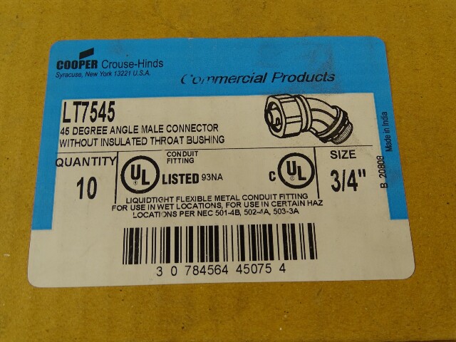 (10) Crouse-Hinds 45° Male Liquidtight Connector 3/4" , LT7545