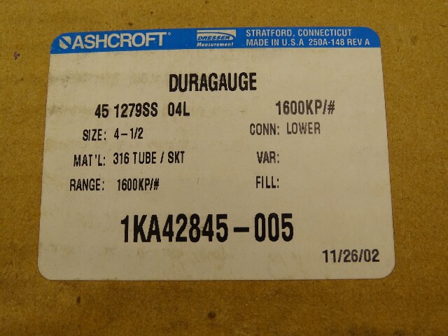 Ashcroft 4-1/2L Duragauge 0-1600kPa (0-220 PSI) , 45-1279SS-04L-1600KP/#