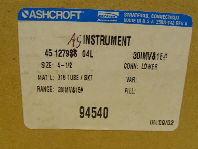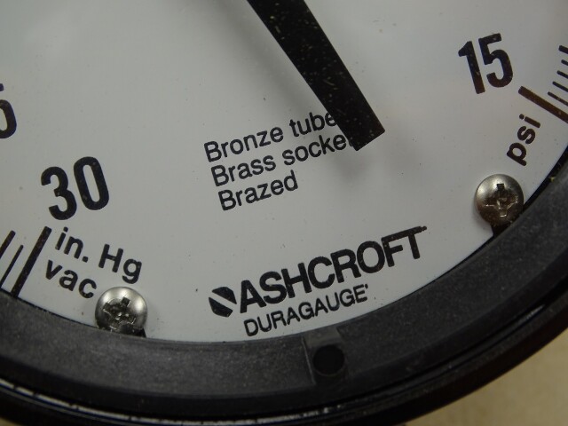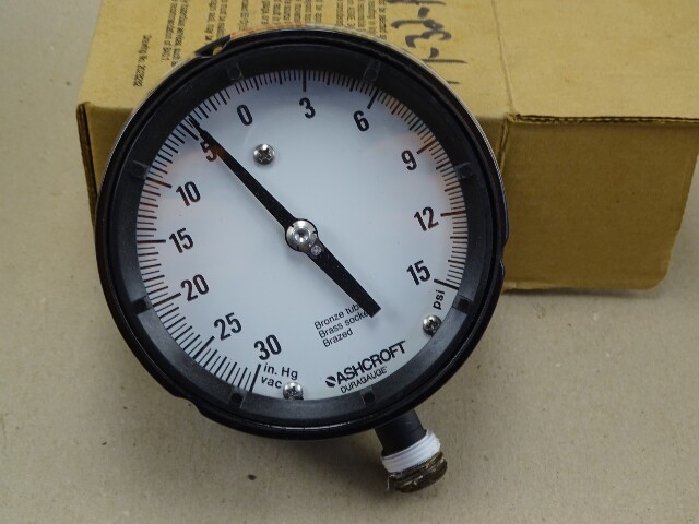 Ashcroft 4.5" Duragauge 30in. Hg vac-15PSI Gauge 1/2, 45-1279AS-04L-30IMV&15#