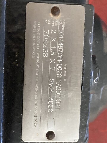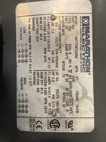 Pump w/ Bronze Impeller. Motor: Marathon model 184TTDB7322AA, 7.5HP, 208-230/460V, 3PH, 3475 RPM, 184JM Frame.