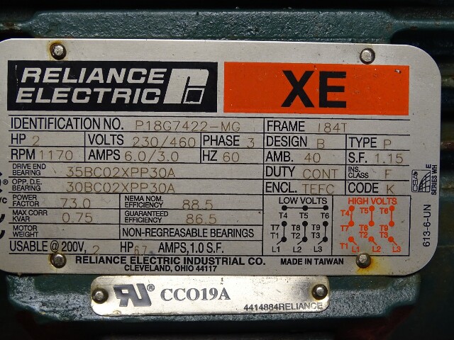 Reliance 2HP XE Electric Motor 3PH, 230/460, 1170RPM, P18G7422-MG