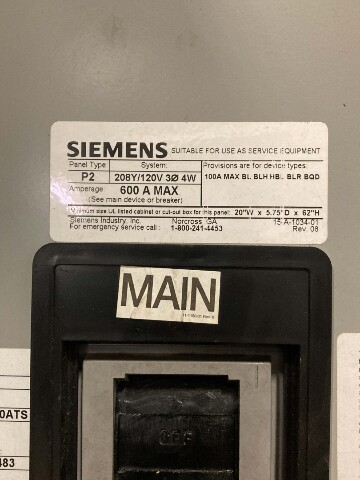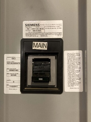 Siemens P2 Panelboard 500A Main Breaker 500A, 208/120V, P2C30L6500ATS