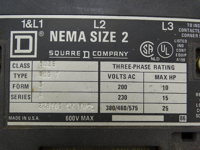 Square D Starter NEMA Size 2 200-575VAC, 10-25HP, 8536 SDG 1 S
